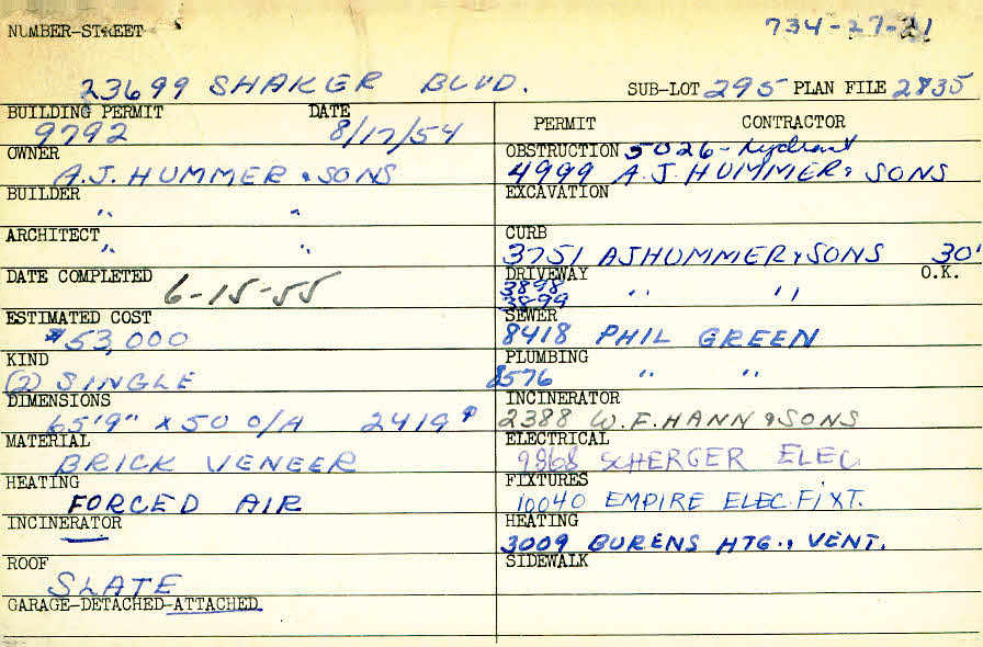 23699 Shaker Boulevard Shaker Heights, OH 44122 PARCEL ID: 734-27-031 Building Permit Date: 08-17-1954 Plan File Number: 2835 scanned, 5098, 5798, 7481, 11518 Microfilm Roll: Roll041, Roll#69, Roll#78, Roll#93, NewRoll#7 Neighborhood: Mercer Owner: A. J. Hummer and Sons Builder: A. J. Hummer and Sons Architect: A. J. Hummer and Sons Estimated Cost: 53000 Date Completed: 06-15-1955 Kind: Single, Single Residence or Dwelling (2) Material: Brick Veneer Heating: Forced Air Roof: Slate Garage: attached |