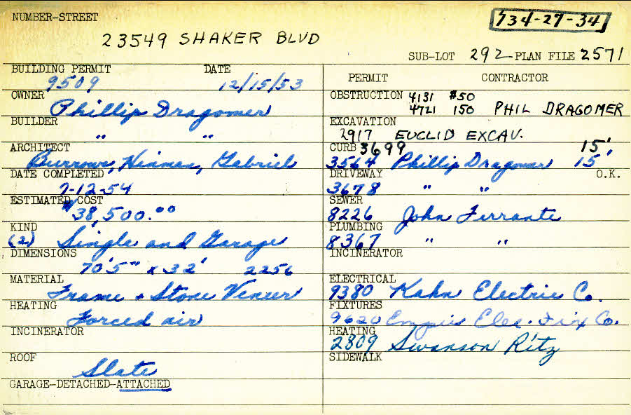 23549 Shaker Boulevard Shaker Heights, OH 44122 PARCEL ID: 734-27-034 Building Permit Date: 12-15-1953 Plan File Number: 2571, 4263 scanned Microfilm Roll: Roll #36, Roll062 Neighborhood: Mercer Owner: Dragomer, Phillip Builder: Dragomer, Phillip Architect: Burrows, Hinman, Gabriel Estimated Cost: 38500 Date Completed: 07-12-1954 Kind: Single Dwelling and Garage (2) Material: Frame and Stone Veneer Heating: Forced Air Roof: Slate Garage: attached |