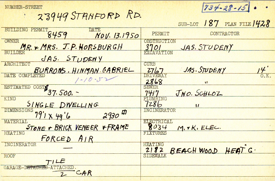 23949 Stanford Road Shaker Heights, OH 44122 PARCEL ID: 734-28-015 Building Permit Date: 11-13-1950 Plan File Number: 1428 all scanned Microfilm Roll: Roll016 Neighborhood: Mercer Owner: Horsburgh, Mr. and Mrs. J. P. Builder: Studeny, James Architect: Burrows, Hinman, Gabriel Estimated Cost: 37500 Date Completed: 01-10-1952 Kind: Single, Single Residence or Dwelling Material: Stone and Brick Veneer and Frame Heating: Forced Air Roof: Tile Garage: attached 2 car |