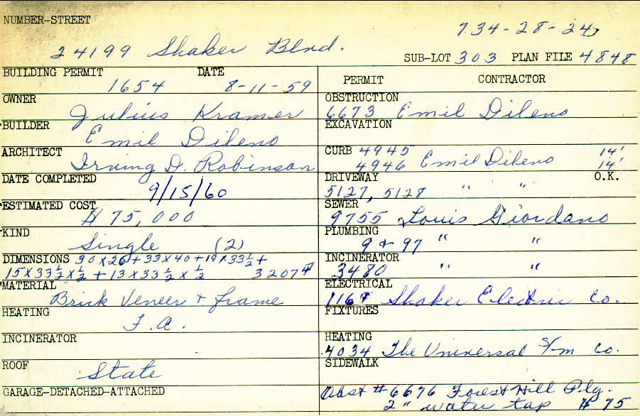 24199 Shaker Boulevard Shaker Heights, OH 44122 PARCEL ID: 734-28-024 Building Permit Date: 08-11-1959 Plan File Number: 4848 Microfilm Roll: Roll#66 Neighborhood: Mercer Owner: Kramer, Julius Builder: Dileno, Emil Architect: Robinson, Irving D. Estimated Cost: 75000 Date Completed: 09-15-1960 Kind: Single, Single Residence or Dwelling (2) Material: Brick Veneer and Frame Heating: Forced Air Roof: Slate |