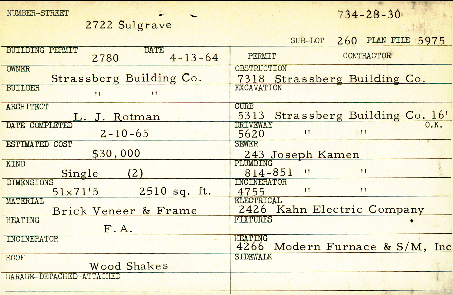 2722 Sulgrave Road Shaker Heights, OH 44122 PARCEL ID: 734-28-030 Building Permit Date: 04-13-1964 Plan File Number: 4908, 5975, 7793 Microfilm Roll: Roll#68, Roll#80, Roll#94 Neighborhood: Mercer Owner: Strassberg Building Company Builder: Strassberg Building Company Architect: Rotman, L. J. Estimated Cost: 30000 Date Completed: 02-10-1965 Kind: Single, Single Residence or Dwelling (2) Material: Brick Veneer and Frame Heating: Forced Air Roof: Wood Shakes |