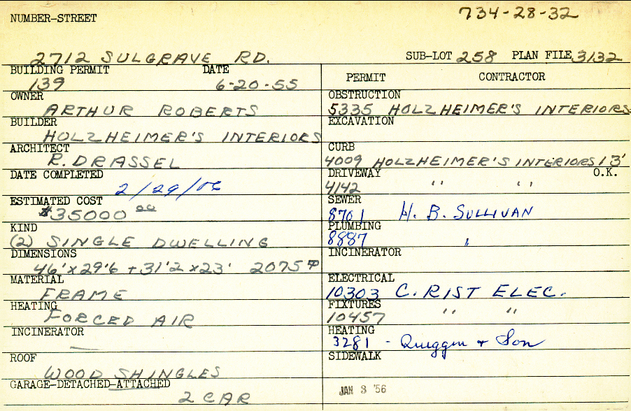 2712 Sulgrave Road Shaker Heights, OH 44122 PARCEL ID: 734-28-032 Building Permit Date: 06-20-1955 Plan File Number: 3132 Microfilm Roll: Roll#44 Neighborhood: Mercer Owner: Roberts, Arthur Builder: Holzheimer's Interiors Architect: Drassel, R. Estimated Cost: 35000 Date Completed: 02-29-1956 Kind: Single, Single Residence or Dwelling (2) Material: Frame Heating: Forced Air Roof: Wood Shingle Garage: attached 2 car |