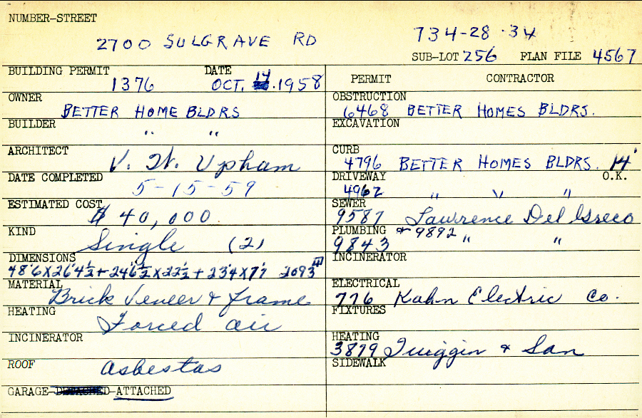 2700 Sulgrave Road Shaker Heights, OH 44122 PARCEL ID: 734-28-034 Building Permit Date: 10-14-1958 Plan File Number: 3976, 4567 all scanned Microfilm Roll: Roll058, Roll064 Neighborhood: Mercer Owner: Better Home Builders Builder: Better Home Builders Architect: Upham, V. W. Estimated Cost: 40000 Date Completed: 05-15-1959 Kind: Single, Single Residence or Dwelling (2) Material: Brick Veneer and Frame Heating: Forced Air Roof: Asbestos Garage: attached |
