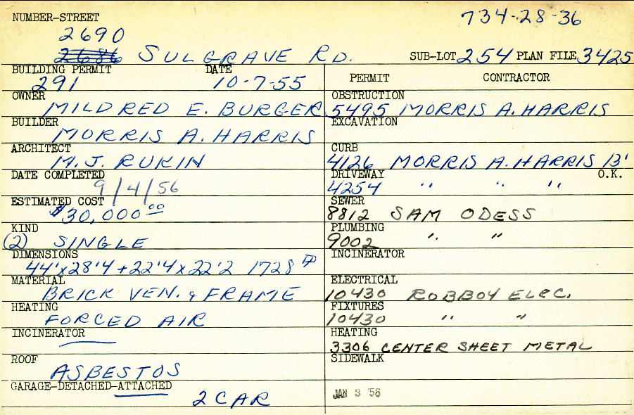 2690 Sulgrave Road Shaker Heights, OH 44122 PARCEL ID: 734-28-036 Building Permit Date: 10-07-1955 Plan File Number: 3425 Neighborhood: Mercer Owner: Burger, Mildred E. Builder: Harris, Morris A. Architect: Rukin, M. J. Estimated Cost: 30000 Date Completed: 09-04-1956 Kind: Single, Single Residence or Dwelling (2) Material: Brick Veneer and Frame Heating: Forced Air Roof: Asbestos Garage: attached 2 car Card Available: yes |