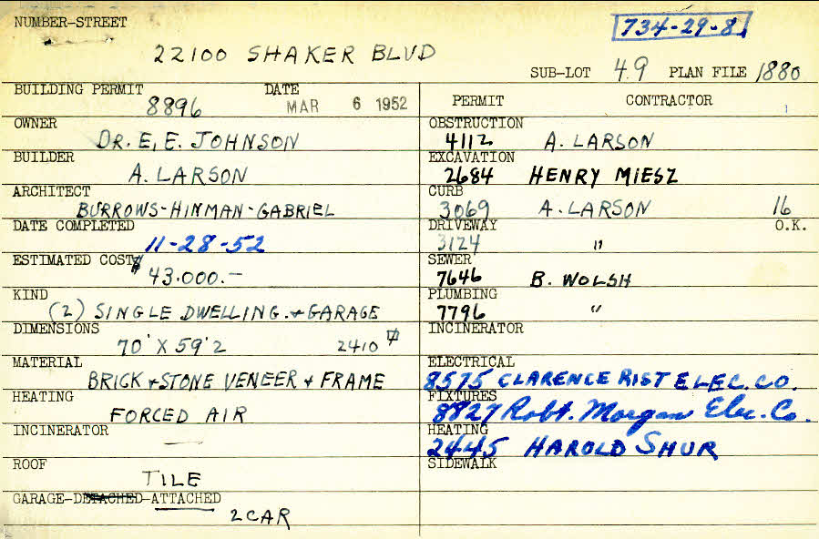 22100 Shaker Boulevard Shaker Heights, OH 44122 PARCEL ID: 734-29-008 Building Permit Date: 03-06-1952 Plan File Number: 1880 all scanned Microfilm Roll: Roll028 Owner: Johnson, Dr. E. E. Builder: Larsen, A. Architect: Burrows, Hinman, Gabriel Estimated Cost: 43000 Date Completed: 11-28-1952 Kind: Single Dwelling and Garage (2) Material: Brick and Stone Veneer and Frame Heating: Forced Air Roof: Tile Garage: attached 2 car |
