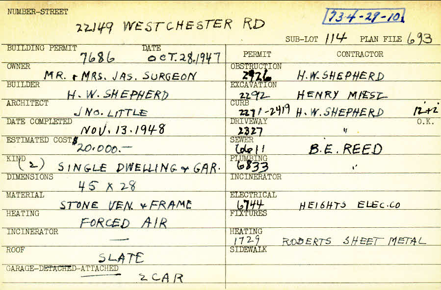 22149 Westchester Road Shaker Heights, OH 44122 PARCEL ID: 734-29-010 Building Permit Date: 10-28-1947 Plan File Number: 693 scanned, 2206 Microfilm Roll: Roll008, Roll#33 Neighborhood: Mercer Owner: Surgeon, Mr. and Mrs. James Builder: Shepherd, H. W. Architect: Little, John W. Estimated Cost: 20000 Date Completed: 11-13-1948 Kind: Single Dwelling and Garage (2) Material: Stone Veneer and Frame Heating: Forced Air Roof: Slate Garage: attached 2 car |