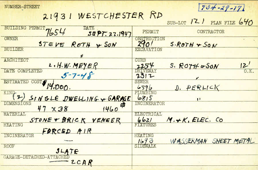 21931 Westchester Road Shaker Heights, OH 44122 PARCEL ID: 734-29-017 Building Permit Date: 09-22-1947 Plan File Number: 640 scanned, 9804 Microfilm Roll: Roll008, Roll#104 Neighborhood: Mercer Owner: Steve Roth and Son Builder: Steve Roth and Son Architect: Meyer, L. H. W. Estimated Cost: 14000 Date Completed: 05-07-1948 Kind: Single Dwelling and Garage (2) Material: Stone and Brick Veneer Heating: Forced Air Roof: Slate Garage: attached 2 car |