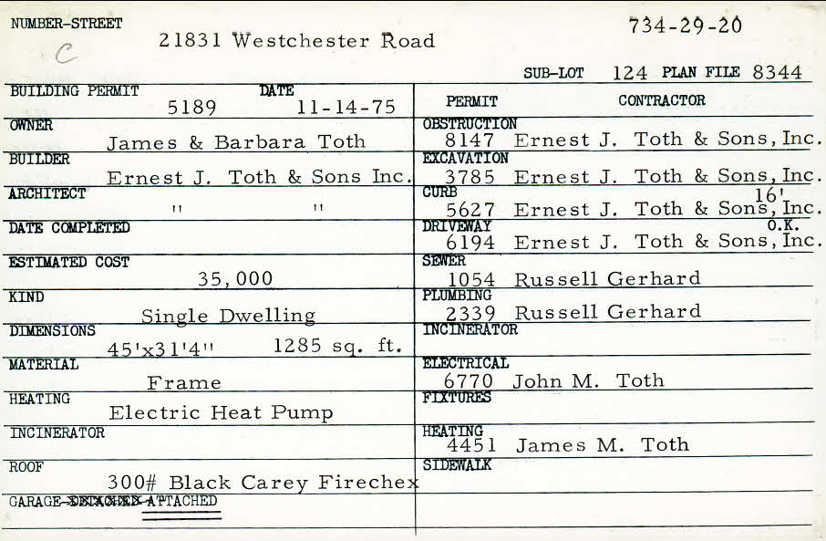 21831 Westchester Road Shaker Heights, OH 44122 PARCEL ID: 734-29-020 Building Permit Date: 11-14-1975 Plan File Number: 8344, 11577 Microfilm Roll: Roll#97, NewRoll#8 Neighborhood: Mercer Owner: Toth, James and Barbara Builder: Ernest J. Toth and Sons, Inc. Architect: Ernest J. Toth and Sons, Inc. Estimated Cost: 35000 Kind: Single, Single Residence or Dwelling Material: Frame Roof: 300# Min Asphalt Garage: attached |