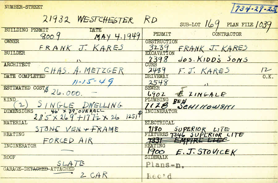 21932 Westchester Road Shaker Heights, OH 44122 PARCEL ID: 734-29-025 Building Permit Date: 05-04-1949 Plan File Number: 1039 scanned, 5463, 6972 Microfilm Roll: Roll013, Roll#74, Roll#90 Neighborhood: Mercer Owner: Kares, Frank J. Builder: Kares, Frank J. Architect: Metzger, Charles A. Estimated Cost: 26000 Date Completed: 11-15-1949 Kind: Single, Single Residence or Dwelling (2) Material: Stone Veneer and Frame Heating: Forced Air Roof: Slate Garage: attached 2 car |
