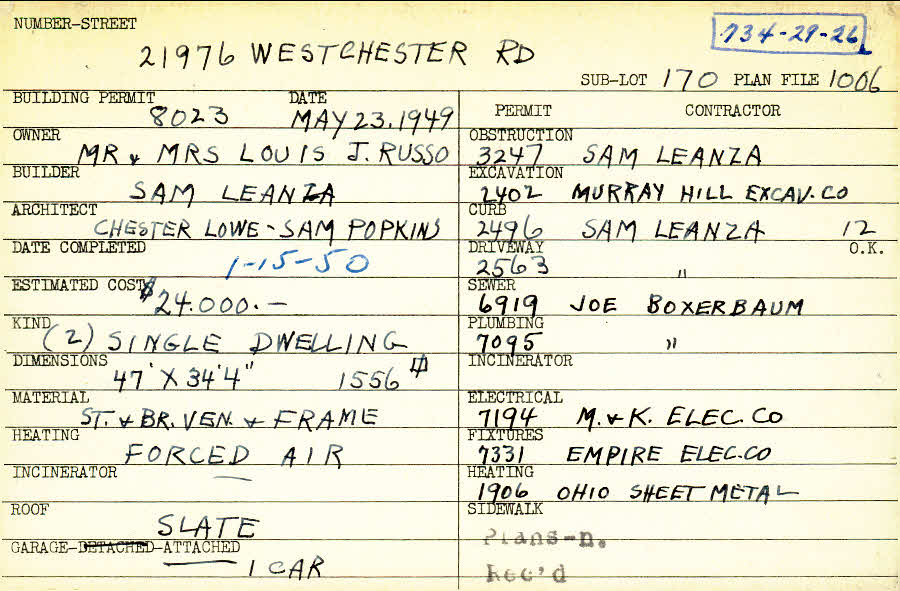 21976 Westchester Road Shaker Heights, OH 44122 PARCEL ID: 734-29-026 Building Permit Date: 05-23-1949 Plan File Number: 1006 scanned, 4754 Microfilm Roll: Roll012, Roll#66 Neighborhood: Mercer Owner: Russo, Mr. and Mrs. Louis Builder: Leanza, Sam Architect: Lowe, Chester and Popkins, Sam Estimated Cost: 24000 Date Completed: 01-15-1950 Kind: Single, Single Residence or Dwelling (2) Material: Stone and Brick Veneer and Frame Heating: Forced Air Roof: Slate Garage: attached |