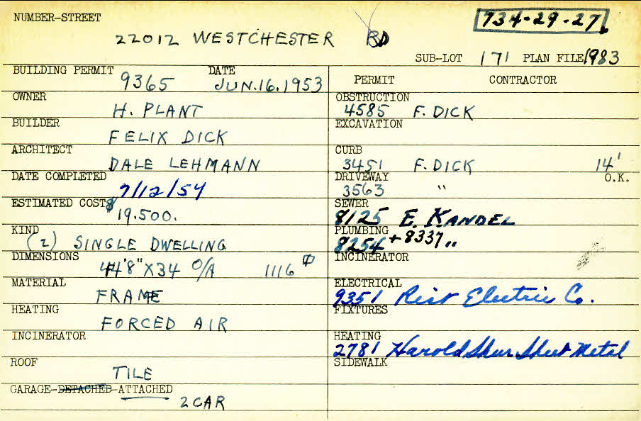 22012 Westchester Road Shaker Heights, OH 44122 PARCEL ID: 734-29-027 Building Permit Date: 06-16-1953 Plan File Number: 1983, 3738 Microfilm Roll: Roll#29, Roll#51 Neighborhood: Mercer Owner: Plant, H. Builder: Dick, Felix Architect: Lehmann, Dale Estimated Cost: 19500 Date Completed: 07-12-1954 Kind: Single, Single Residence or Dwelling (2) Material: Frame Heating: Forced Air Roof: Tile Garage: attached 2 car |