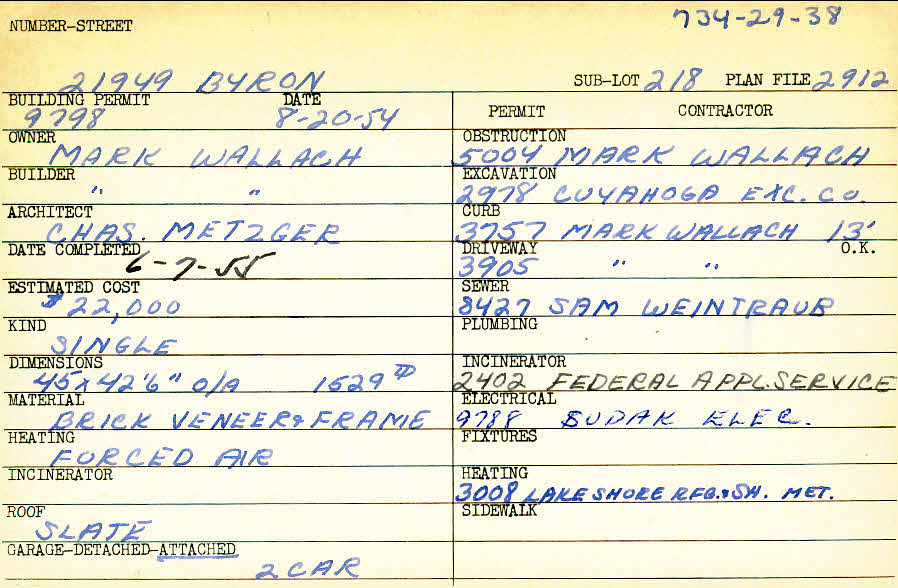 21949 Byron Road Shaker Heights, OH 44122 PARCEL ID: 734-29-038 Building Permit Date: 08-20-1954 Plan File Number: 2912 all scanned Microfilm Roll: Roll041 Neighborhood: Mercer Owner: Wallach, Mark Builder: Wallach, Mark Architect: Metzger, Charles A. Estimated Cost: 22000 Date Completed: 06-07-1955 Kind: Single, Single Residence or Dwelling Material: Brick Veneer and Frame Heating: Forced Air Roof: Slate Garage: attached 2 car |
