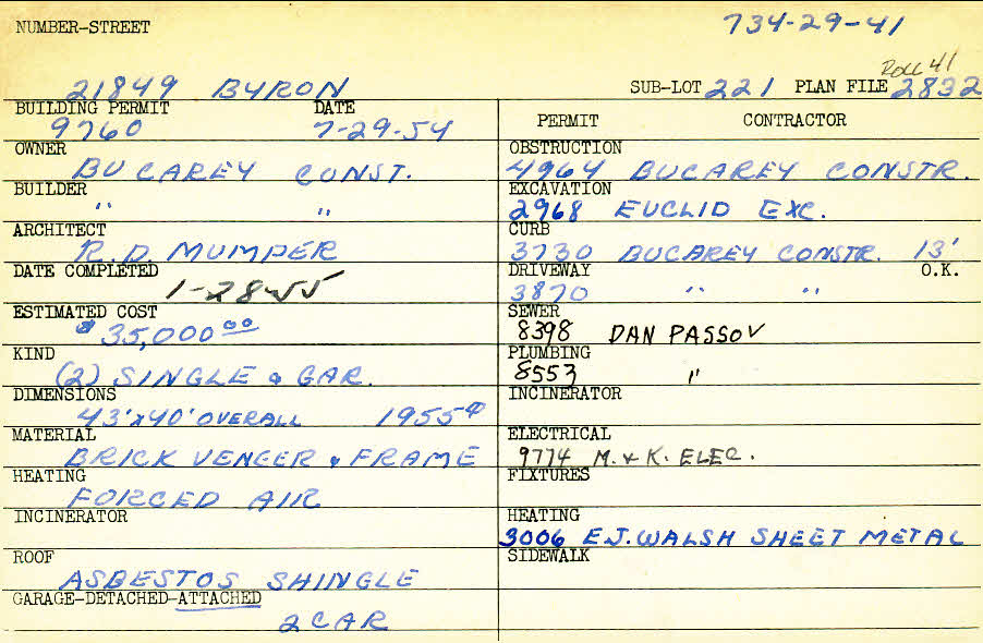 21849 Byron Road Shaker Heights, OH 44122 PARCEL ID: 734-29-041 Building Permit Date: 07-29-1954 Plan File Number: 2832 all scanned Microfilm Roll: Roll041 Neighborhood: Mercer Owner: Bucarey Construction Builder: Bucarey Construction Architect: Mumper, R. D. Estimated Cost: 35000 Date Completed: 01-28-1955 Kind: Single Dwelling and Garage (2) Material: Brick Veneer and Frame Heating: Forced Air Roof: Asbestos Shingles Garage: attached 2 car |
