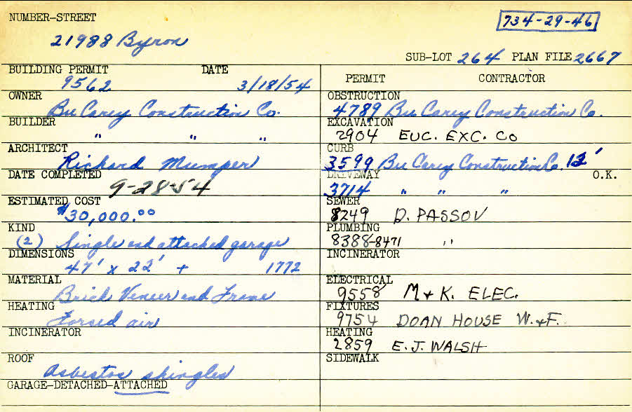 21988 Byron Road Shaker Heights, OH 44122 PARCEL ID: 734-29-046 Building Permit Date: 03-18-1954 Plan File Number: 2667 Microfilm Roll: Roll #37 Neighborhood: Mercer Owner: BuCarey Construction Company Builder: BuCarey Construction Company Architect: Mumper, Richard Estimated Cost: 30000 Date Completed: 09-28-1954 Kind: Single Dwelling and Garage (2) Material: Brick Veneer and Frame Heating: Forced Air Roof: Asbestos Shingles Garage: attached |