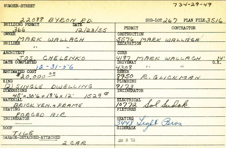 22088 Byron Road Shaker Heights, OH 44122 PARCEL ID: 734-29-049 Building Permit Date: 12-23-1955 Plan File Number: 3516 Microfilm Roll: Roll#51 Neighborhood: Mercer Owner: Wallach, Mark Builder: Wallach, Mark Architect: Chelenko, Joseph Estimated Cost: 20000 Date Completed: 12-31-1956 Kind: Single, Single Residence or Dwelling (2) Material: Brick Veneer and Frame Heating: Forced Air Roof: Tile Garage: attached 2 car |