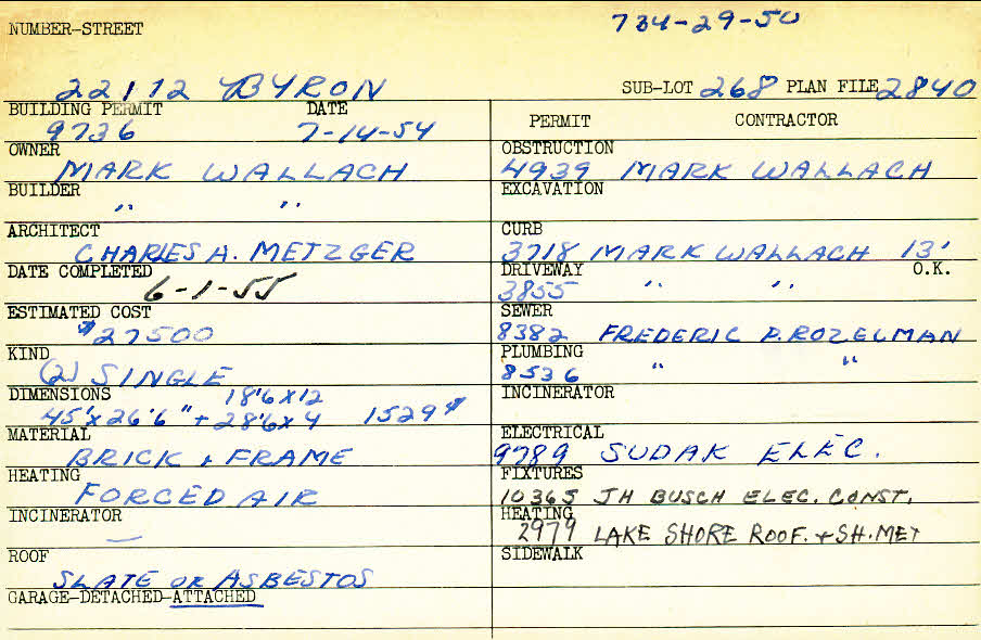 22112 Byron Road Shaker Heights, OH 44122 PARCEL ID: 734-29-050 Building Permit Date: 07-14-1954 Plan File Number: 2840 all scanned Microfilm Roll: Roll041 Neighborhood: Mercer Owner: Wallach, Mark Builder: Wallach, Mark Architect: Metzger, Charles A. Estimated Cost: 27500 Date Completed: 06-01-1955 Kind: Single, Single Residence or Dwelling (2) Material: Brick and Frame Heating: Forced Air Garage: attached |