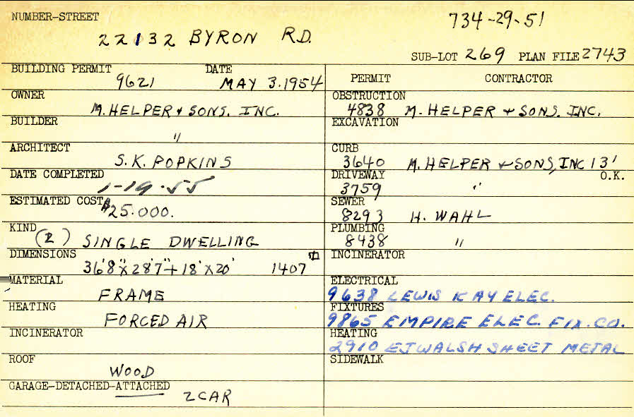 22132 Byron Road Shaker Heights, OH 44122 PARCEL ID: 734-29-051 Building Permit Date: 05-03-1954 Plan File Number: 2743 Microfilm Roll: Roll #38 Neighborhood: Mercer Owner: M. Helper and Sons Inc. Builder: M. Helper and Sons Inc. Architect: Popkins, S. K. Estimated Cost: 25000 Date Completed: 01-19-1955 Kind: Single, Single Residence or Dwelling (2) Material: Frame Heating: Forced Air Roof: Wood Garage: attached 2 car |