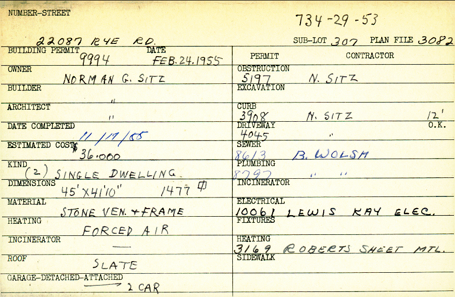22087 Rye Road Shaker Heights, OH 44122 PARCEL ID: 734-29-053 Building Permit Date: 02-24-1955 Plan File Number: ?? not scanned, 3082 scanned Microfilm Roll: Roll#41, Roll043 Neighborhood: Mercer Owner: Sitz, Norman G. Builder: Sitz, Norman G. Architect: Sitz, Norman G. Estimated Cost: 36000 Date Completed: 11-17-1955 Kind: Single, Single Residence or Dwelling (2) Material: Stone Veneer and Frame Heating: Forced Air Roof: Slate Garage: attached 2 car |