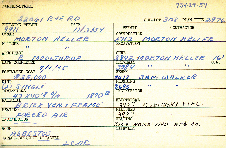 22061 Rye Road Shaker Heights, OH 44122 PARCEL ID: 734-29-054 Building Permit Date: 11-03-1954 Plan File Number: 2976 Microfilm Roll: Roll#42 Neighborhood: Mercer Owner: Heller, Morton Builder: Heller, Morton Architect: Moulthrop, R. Estimated Cost: 25000 Date Completed: 07-07-1955 Kind: Single, Single Residence or Dwelling (2) Material: Brick Veneer and Frame Heating: Forced Air Roof: Asbestos Garage: attached 2 car |