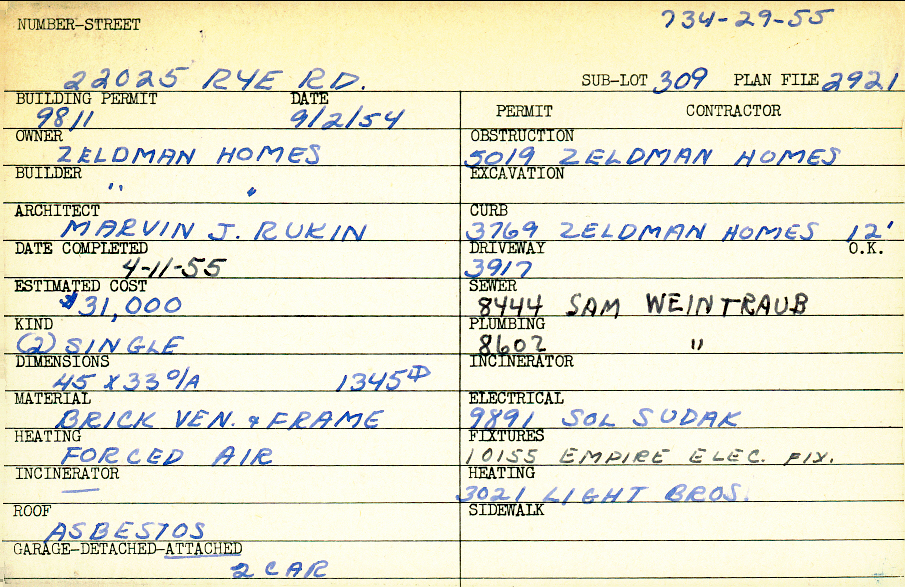 22025 Rye Road Shaker Heights, OH 44122 PARCEL ID: 734-29-055 Building Permit Date: 09-02-1954 Plan File Number: 2921 scanned, 12546 Microfilm Roll: Roll041, NewRoll#13 Neighborhood: Mercer Owner: Zeldman Homes Builder: Zeldman Homes Architect: Rukin, Marvin J. Estimated Cost: 31000 Date Completed: 04-11-1955 Kind: Single, Single Residence or Dwelling (2) Material: Brick Veneer and Frame Heating: Forced Air Roof: Asbestos Garage: attached 2 car |
