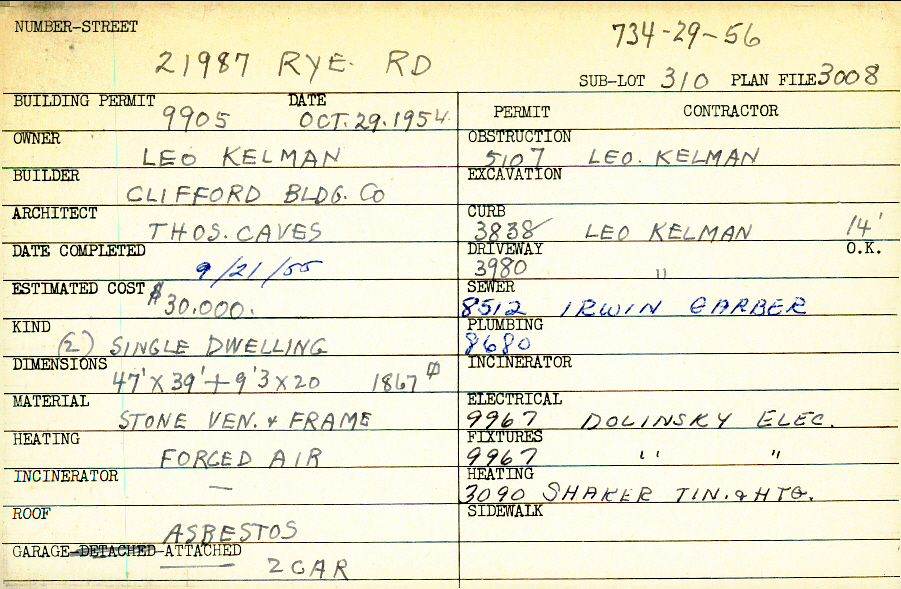 21987 Rye Road Shaker Heights, OH 44122 PARCEL ID: 734-29-056 Building Permit Date: 10-29-1954 Plan File Number: 3008 Microfilm Roll: Roll#42 Neighborhood: Mercer Owner: Kelman, Leo Builder: Clifford Building Company Architect: Caves, Thomas Estimated Cost: 30000 Date Completed: 09-21-1955 Kind: Single, Single Residence or Dwelling (2) Material: Stone Veneer and Frame Heating: Forced Air Roof: Asbestos Garage: attached 2 car |