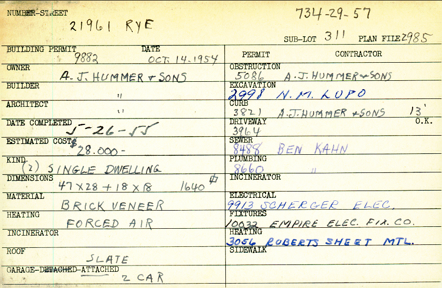 21961 Rye Road Shaker Heights, OH 44122 PARCEL ID: 734-29-057 Building Permit Date: 10-14-1954 Plan File Number: 2985 Microfilm Roll: Roll#42 Neighborhood: Mercer Owner: A. J. Hummer and Sons Builder: A. J. Hummer and Sons Architect: A. J. Hummer and Sons Estimated Cost: 28000 Date Completed: 05-26-1955 Kind: Single, Single Residence or Dwelling (2) Material: Brick Veneer Heating: Forced Air Roof: Slate Garage: attached 2 car |