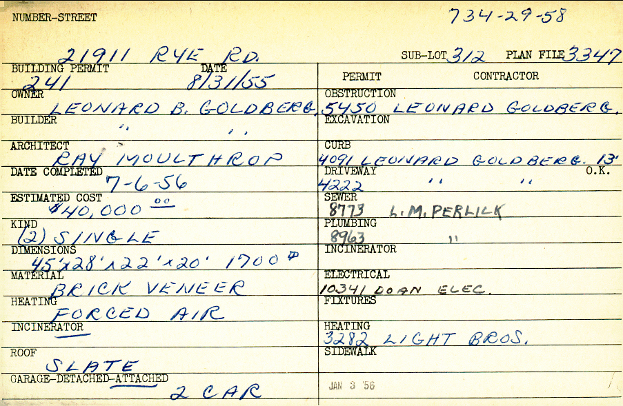 21911 Rye Road Shaker Heights, OH 44122 PARCEL ID: 734-29-058 Building Permit Date: 08-31-1955 Plan File Number: 3347 Microfilm Roll: Roll#48 Neighborhood: Mercer Owner: Goldberg, Leonard B. Builder: Goldberg, Leonard B. Architect: Moulthrop, Ray Estimated Cost: 40000 Date Completed: 07-06-1956 Kind: Single, Single Residence or Dwelling (2) Material: Brick Veneer Heating: Forced Air Roof: Slate Garage: attached 2 car |