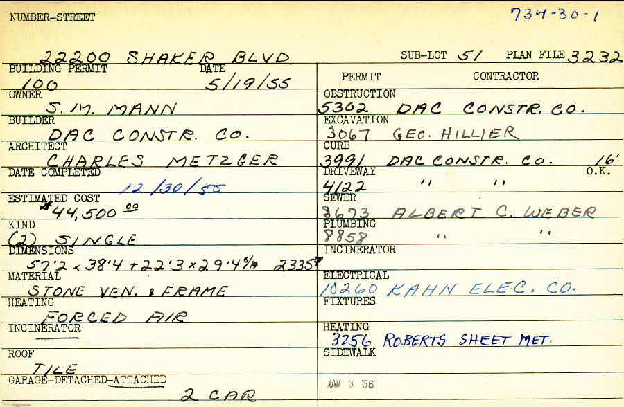 22200 Shaker Boulevard Shaker Heights, OH 44122 PARCEL ID: 734-30-001 Building Permit Date: 05-19-1955 Plan File Number: 3232 scanned Microfilm Roll: Roll047 Owner: Mann, S. M. Builder: DAC Construction Company Architect: Metzger, Charles A. Estimated Cost: 44500 Date Completed: 12-30-1955 Kind: Single, Single Residence or Dwelling (2) Material: Stone Veneer and Frame Heating: Forced Air Roof: Tile Garage: attached 2 car |