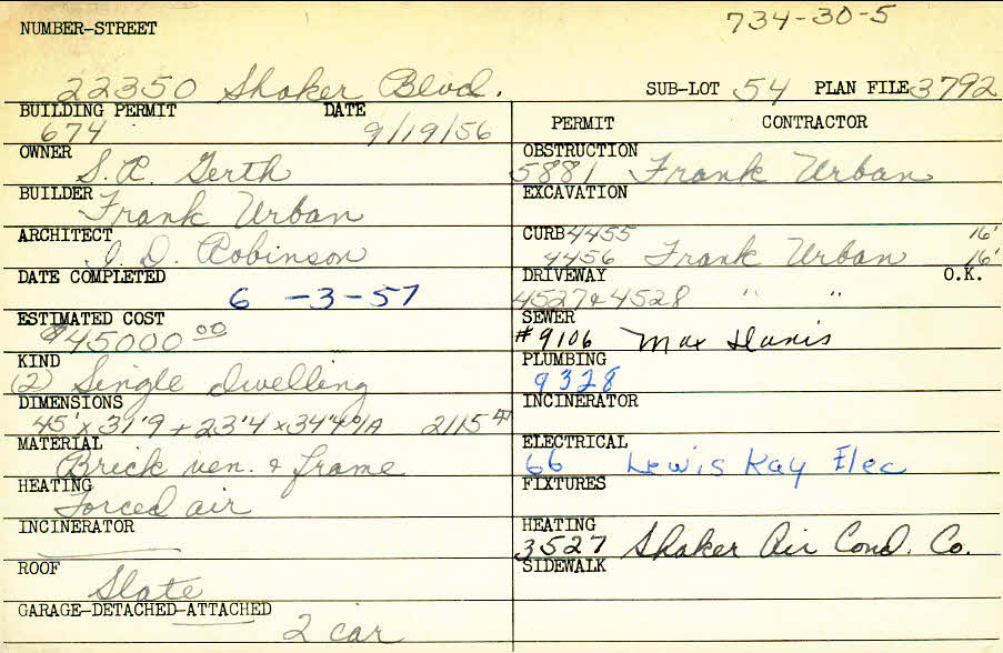 22350 Shaker Boulevard Shaker Heights, OH 44122 PARCEL ID: 734-30-005 Building Permit Date: 09-19-1956 Plan File Number: 3792 Microfilm Roll: Roll#56 Neighborhood: Mercer Owner: Gerth, S. R. Builder: Urban, Frank Architect: Robinson, I. D. Estimated Cost: 45000 Date Completed: 06-03-1957 Kind: Single, Single Residence or Dwelling (2) Material: Brick Veneer and Frame Heating: Forced Air Roof: Slate Garage: attached 2 car |