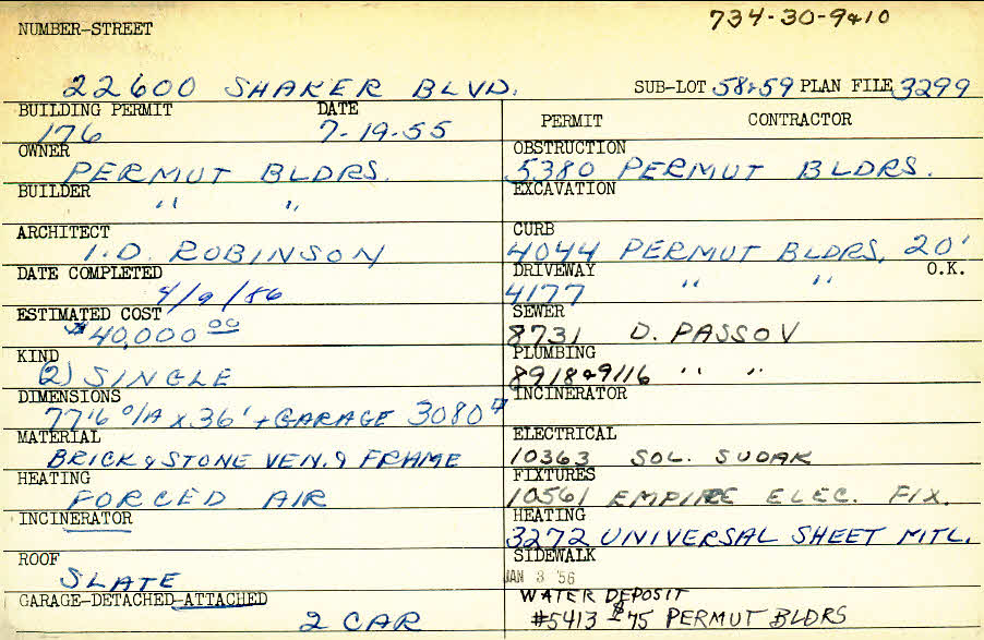 22600 Shaker Boulevard Shaker Heights, OH 44122 PARCEL ID: 734-30-009 Building Permit Date: 07-19-1955 Plan File Number: 3299 Microfilm Roll: Roll#48 Neighborhood: Mercer Owner: Permut Builders Builder: Permut Builders Architect: Robinson, I. D. Estimated Cost: 40000 Date Completed: 04-09-1956 Kind: Single, Single Residence or Dwelling (2) Material: Brick and Stone Veneer and Frame Heating: Forced Air Roof: Slate Garage: attached 2 car |