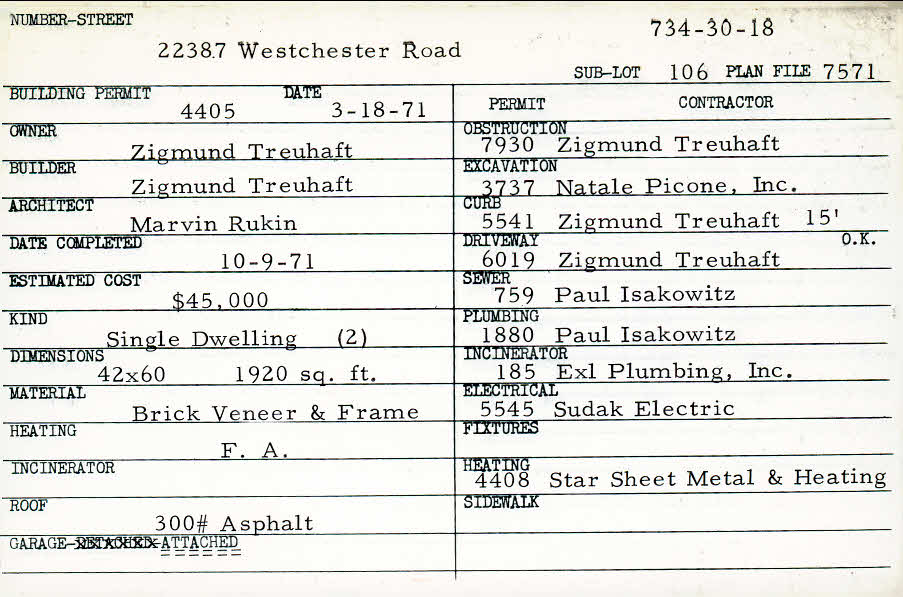 22387 Westchester Road Shaker Heights, OH 44122 PARCEL ID: 734-30-018 Building Permit Date: 03-18-1971 Plan File Number: 7571, 11777 Microfilm Roll: Roll#93, NewRoll#9 Neighborhood: Mercer Owner: Treuhaft, Zigmund Builder: Treuhaft, Zigmund Architect: Rukin, Marvin Estimated Cost: 45000 Date Completed: 10-09-1971 Kind: Single, Single Residence or Dwelling (2) Material: Brick Veneer and Frame Heating: Forced Air Roof: 300# Min Asphalt Garage: attached |