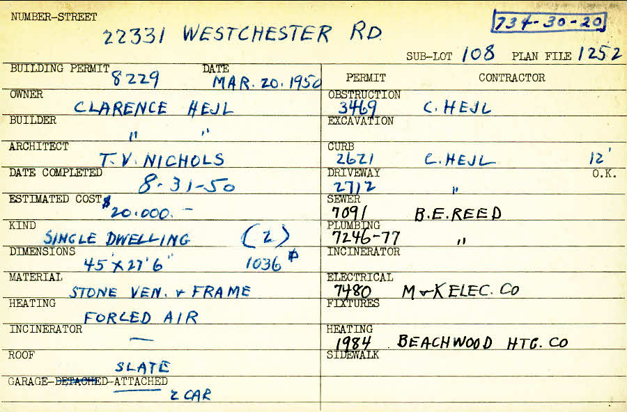 22331 Westchester Road Shaker Heights, OH 44122 PARCEL ID: 734-30-020 Building Permit Date: 03-20-1950 Plan File Number: 1252 all scanned Microfilm Roll: Roll015 Neighborhood: Mercer Owner: Hejl, Clarence Builder: Hejl, Clarence Architect: Nichols, T. V. Estimated Cost: 20000 Date Completed: 08-31-1950 Kind: Single, Single Residence or Dwelling (2) Material: Stone Veneer and Frame Heating: Forced Air Roof: Slate Garage: attached 2 car |