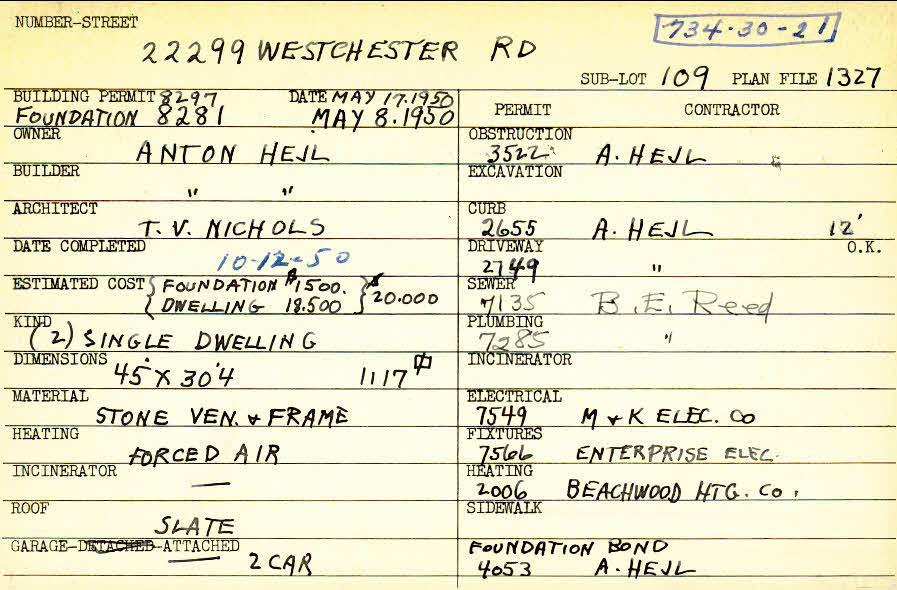 22299 Westchester Road Shaker Heights, OH 44122 PARCEL ID: 734-30-021 Building Permit Date: 05-08-1950 Plan File Number: 1327 all scanned Microfilm Roll: Roll015 Neighborhood: Mercer Owner: Hejl, Anton Builder: Hejl, Anton Architect: Nichols, T. V. Estimated Cost: 20000 Date Completed: 10-12-1950 Kind: Single, Single Residence or Dwelling (2) Material: Stone Veneer and Frame Heating: Forced Air Roof: Slate Garage: attached 2 car |