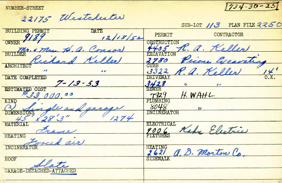 22175 Westchester Road Shaker Heights, OH 44122 PARCEL ID: 734-30-025 Building Permit Date: 12-18-1952 Plan File Number: 2250, 7152, 12156 Microfilm Roll: Roll#33, Roll#91, NewRoll#11 Neighborhood: Mercer Owner: Consor, Mr. and Mrs. H. A. Builder: Keller, Richard A. Architect: Keller, Richard A. Estimated Cost: 33000 Date Completed: 07-13-1953 Kind: Single Dwelling and Garage (2) Material: Frame Heating: Forced Air Roof: Slate Garage: attached |