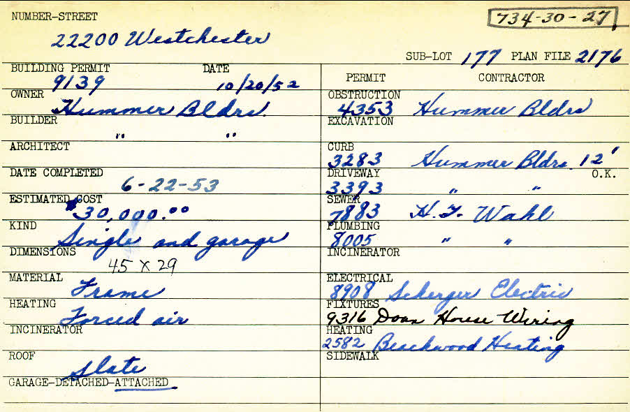 22200 Westchester Road Shaker Heights, OH 44122 PARCEL ID: 734-30-027 Building Permit Date: 10-20-1952 Plan File Number: 2176, 6133 Microfilm Roll: Roll#33, Roll#83 Neighborhood: Mercer Owner: Hummer Builders Builder: Hummer Builders Estimated Cost: 30000 Date Completed: 06-22-1953 Kind: Single Dwelling and Garage Material: Frame Heating: Forced Air Roof: Slate Garage: attached |