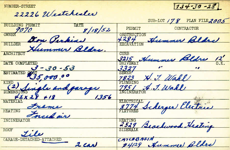 22226 Westchester Road Shaker Heights, OH 44122 PARCEL ID: 734-30-028 Building Permit Date: 08-18-1952 Plan File Number: 2005 Microfilm Roll: Roll#31 Neighborhood: Mercer Owner: Perkins, Don Builder: Hummer Builders Estimated Cost: 35000 Date Completed: 03-30-1953 Kind: Single Dwelling and Garage (2) Material: Frame Heating: Forced Air Roof: Tile Garage: attached 2 car |