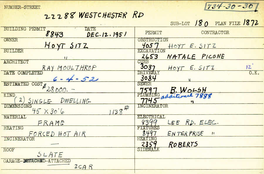 22288 Westchester Road Shaker Heights, OH 44122 PARCEL ID: 734-30-030 Building Permit Date: 12-12-1951 Plan File Number: 1872 all scanned Microfilm Roll: Roll028 Neighborhood: Mercer Owner: Sitz, Hoyt Builder: Sitz, Hoyt Architect: Moulthrop, Ray Estimated Cost: 28000 Date Completed: 06-04-1952 Kind: Single, Single Residence or Dwelling (2) Material: Frame Heating: Forced Air Roof: Slate Garage: attached 2 car |