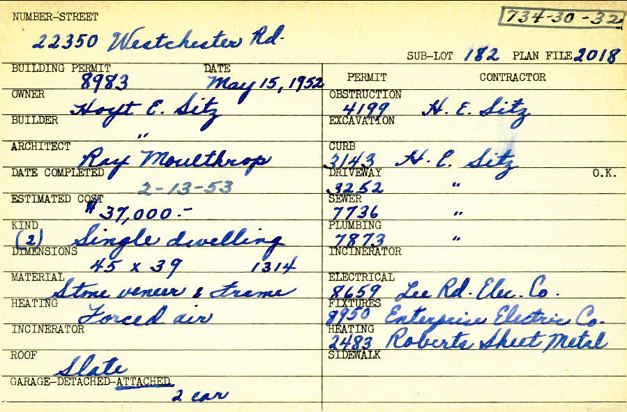 22350 Westchester Road Shaker Heights, OH 44122 PARCEL ID: 734-30-032 Building Permit Date: 05-15-1952 Plan File Number: 2018, 9707 Microfilm Roll: Roll#31, Roll#104 Neighborhood: Mercer Owner: Sitz, Hoyt E. Builder: Sitz, Hoyt E. Architect: Moulthrop, Ray Estimated Cost: 37000 Date Completed: 02-13-1953 Kind: Single, Single Residence or Dwelling (2) Material: Stone Veneer and Frame Heating: Forced Air Roof: Slate Garage: attached 2 car |