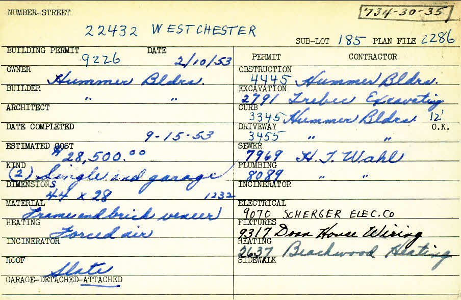 22432 Westchester Road Shaker Heights, OH 44122 PARCEL ID: 734-30-035 Building Permit Date: 02-10-1953 Plan File Number: 2286, 11851 Microfilm Roll: Roll#33, NewRoll#9 Neighborhood: Mercer Owner: Hummer Builders Builder: Hummer Builders Estimated Cost: 28500 Date Completed: 09-15-1953 Kind: Single Dwelling and Garage (2) Material: Frame and Brick Veneer Heating: Forced Air Roof: Slate Garage: attached Blueprints: online, see link above |