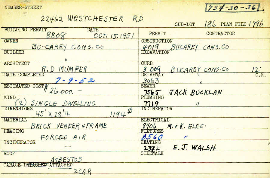 22462 Westchester Road Shaker Heights, OH 44122 PARCEL ID: 734-30-036 Building Permit Date: 10-15-1951 Plan File Number: 1796 scanned, 7482, 10090 Microfilm Roll: Roll027, Roll#93, Roll#106 Neighborhood: Mercer Owner: Bu-Carey Construction Company Builder: Bu-Carey Construction Company Architect: Mumper, R. D. Estimated Cost: 26000 Date Completed: 07-09-1952 Kind: Single, Single Residence or Dwelling (2) Material: Brick Veneer and Frame Heating: Forced Air Roof: Asbestos Garage: attached 2 car |