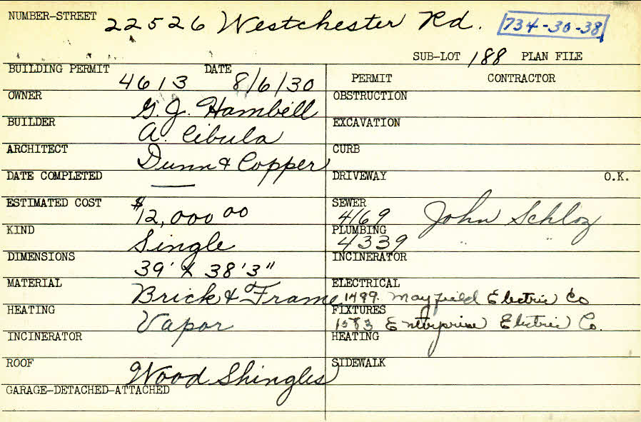 22526 Westchester Road Shaker Heights, OH 44122 PARCEL ID: 734-30-038 Building Permit Date: 08-06-1930 Plan File Number: 7774 Microfilm Roll: Roll#94 Neighborhood: Mercer Owner: Hambell, G. J. Builder: Cibula, A. Architect: Dunn and Copper Estimated Cost: 12000 Kind: Single, Single Residence or Dwelling Material: Brick and Frame Heating: Vapor Roof: Wood Shingle |