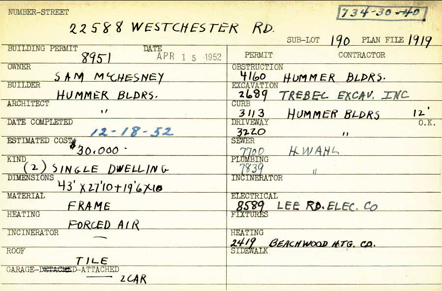 22588 Westchester Road Shaker Heights, OH 44122 PARCEL ID: 734-30-040 Building Permit Date: 04-15-1952 Plan File Number: 1919, 3809, 5781, 12313 all scanned Microfilm Roll: Roll029, Roll056, Roll078, NewRoll12 Neighborhood: Mercer Owner: McChesney, Sam Builder: Hummer Builders Architect: Hummer Builders Estimated Cost: 30000 Date Completed: 12-18-1952 Kind: Single, Single Residence or Dwelling (2) Material: Frame Heating: Forced Air Roof: Tile Garage: attached 2 car |
