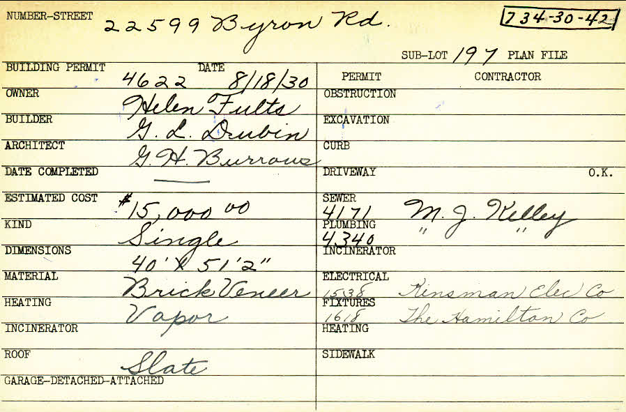 22599 Byron Road Shaker Heights, OH 44122 PARCEL ID: 734-30-042 Building Permit Date: 08-18-1930 Plan File Number: 5348 Microfilm Roll: Roll#73 Neighborhood: Mercer Owner: Fults, Helen Builder: Dubin, G. L. Architect: Burrows, G. H. Estimated Cost: 15000 Kind: Single, Single Residence or Dwelling Material: Brick Veneer Heating: Vapor Roof: Slate |