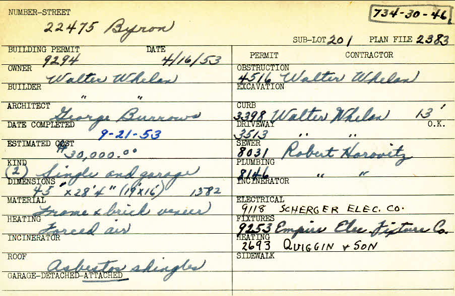 22475 Byron Road Shaker Heights, OH 44122 PARCEL ID: 734-30-046 Building Permit Date: 04-16-1953 Plan File Number: 2383, 7489 Microfilm Roll: Roll#34, Roll#93 Neighborhood: Mercer Owner: Whelan, Walter Builder: Whelan, Walter Architect: Burrows, George Estimated Cost: 30000 Date Completed: 09-21-1953 Kind: Single Dwelling and Garage (2) Material: Frame and Brick Veneer Heating: Forced Air Roof: Asbestos Shingles Garage: attached |