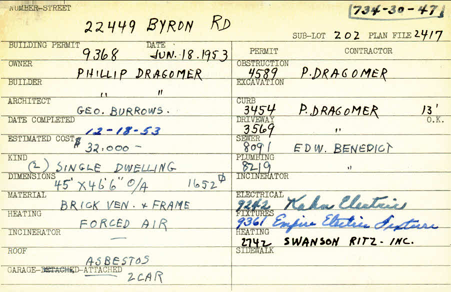 22449 Byron Road Shaker Heights, OH 44122 PARCEL ID: 734-30-047 Building Permit Date: 06-18-1953 Plan File Number: 2417 scanned, 4694 Microfilm Roll: Roll035, Roll#65 Neighborhood: Mercer Owner: Dragomer, Phillip Builder: Dragomer, Phillip Architect: Burrows, George Estimated Cost: 32000 Date Completed: 12-18-1953 Kind: Single, Single Residence or Dwelling (2) Material: Brick Veneer and Frame Heating: Forced Air Roof: Asbestos Garage: attached 2 car |