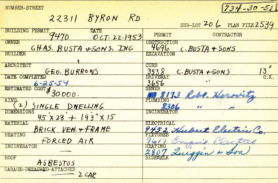 22311 Byron Road Shaker Heights, OH 44122 PARCEL ID: 734-30-051 Building Permit Date: 10-22-1953 Plan File Number: 2539, 7561 Microfilm Roll: Roll #36, Roll#93 Neighborhood: Mercer Owner: Charles Busta and Sons, Inc. Builder: Charles Busta and Sons, Inc. Architect: Burrows, George Estimated Cost: 30000 Date Completed: 06-25-1954 Kind: Single, Single Residence or Dwelling (2) Material: Brick Veneer and Frame Heating: Forced Air Roof: Asbestos Garage: attached 2 car |
