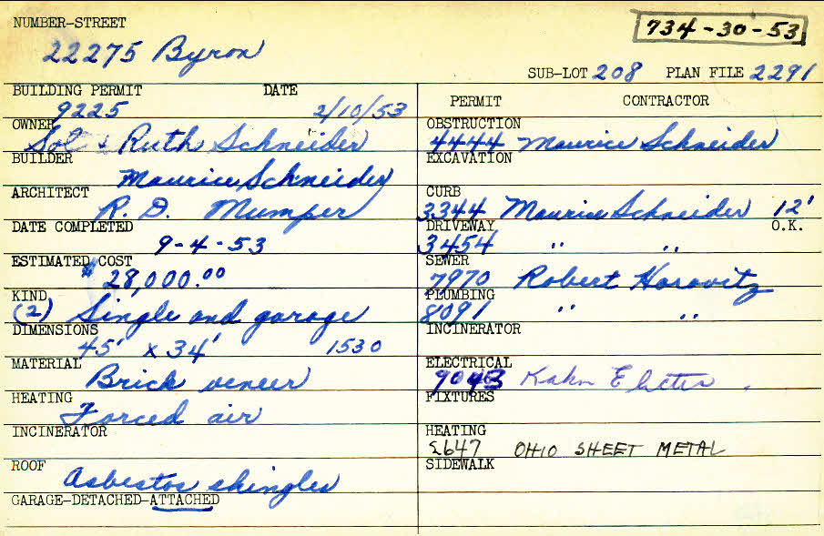 22275 Byron Road Shaker Heights, OH 44122 PARCEL ID: 734-30-053 Building Permit Date: 02-10-1953 Plan File Number: 2291, 11166 Microfilm Roll: Roll#34, NewRoll#7 Neighborhood: Mercer Owner: Schneider, Sol and Ruth Builder: Schneider, Maurice Architect: Mumper, R. D. Estimated Cost: 28000 Date Completed: 09-04-1953 Kind: Single Dwelling and Garage (2) Material: Brick Veneer Heating: Forced Air Roof: Asbestos Shingles Garage: attached |