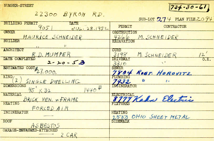 22300 Byron Road Shaker Heights, OH 44122 PARCEL ID: 734-30-061 Building Permit Date: 07-28-1952 Plan File Number: 2094 Microfilm Roll: Roll#32 Neighborhood: Mercer Owner: Schneider, Maurice Builder: Schneider, Maurice Architect: Mumper, R. D. Estimated Cost: 27000 Date Completed: 02-20-1953 Kind: Single, Single Residence or Dwelling (2) Material: Brick Veneer and Frame Heating: Forced Air Roof: Asbestos Garage: attached 2 car |