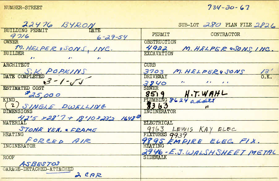 22476 Byron Road Shaker Heights, OH 44122 PARCEL ID: 734-30-067 Building Permit Date: 06-29-1954 Plan File Number: 2826 scanned, 5102 Microfilm Roll: Roll041, Roll#70 Neighborhood: Mercer Owner: M. Helper and Sons Inc. Builder: M. Helper and Sons Inc. Architect: Popkins, S. K. Estimated Cost: 25000 Date Completed: 03-01-1955 Kind: Single, Single Residence or Dwelling (2) Material: Stone Veneer and Frame Heating: Forced Air Roof: Asbestos Garage: attached 2 car |
