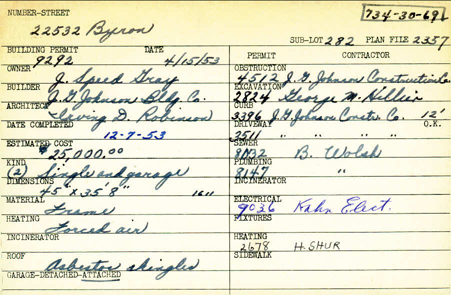 22532 Byron Road Shaker Heights, OH 44122 PARCEL ID: 734-30-069 Building Permit Date: 04-15-1953 Plan File Number: 2357 Neighborhood: Mercer Owner: Gray, J. Speed Builder: J. G. Johndon Building Company Architect: Robinson, Irving D. Estimated Cost: 25000 Date Completed: 12-07-1953 Kind: Single Dwelling and Garage (2) Material: Frame Heating: Forced Air Roof: Asbestos Shingles Garage: attached Card Available: yes |